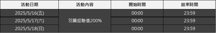 活動名稱:羽翼經驗200%加倍活動