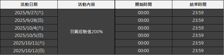 活動名稱:羽翼經驗200%加倍活動