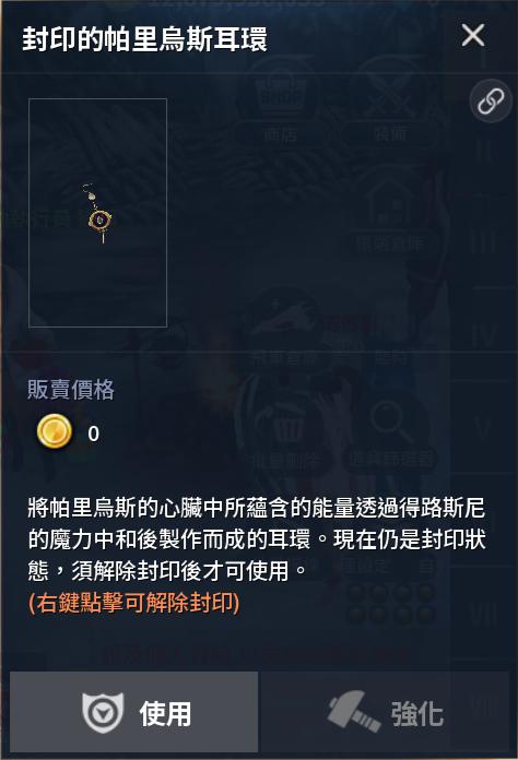 解除【封印的帕里屋斯耳環】的封印後會獲得隨機等級&屬性的耳環。