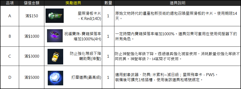 5.本次活動獎勵不得重複領取,例如儲值達1萬,只能領取一次A的道具獎勵。