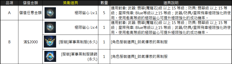 ※若滿足儲值滿2000元條件,則A與B品項的獎勵皆可獲得。
