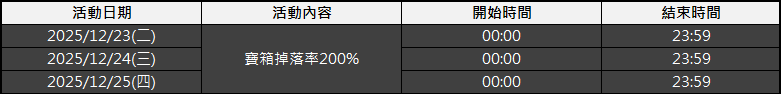 - 活動期間擊殺怪物獲取的寶箱掉落率將提升為200%。