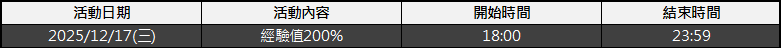 - 活動期間擊殺怪物獲取的經驗值將提升為200%。