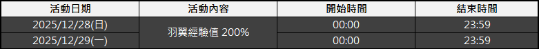 - 活動期間擊殺怪物獲取的羽翼經驗值將提升為200%。
