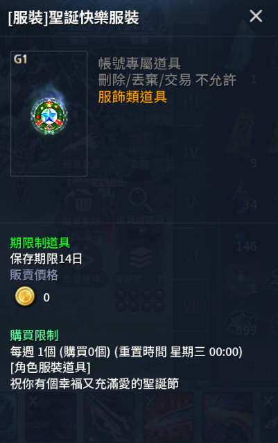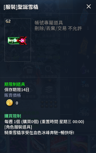 這次聖誕老人為了各位戰士們,特別準備了"[服裝]鹿角+魯道夫鼻子(永久)"、"[服裝]聖誕快樂服裝(14日)"、"[服裝]聖誕雪橇(14日)"、"雪之星 HP藥水"、"Happy Birthday 戒指"等好禮來給大家做兌換,帶來滿滿的冬日禮物!