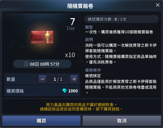 一、販售期間內,每個帳號可購買各種類的隨機寶箱卷一次。