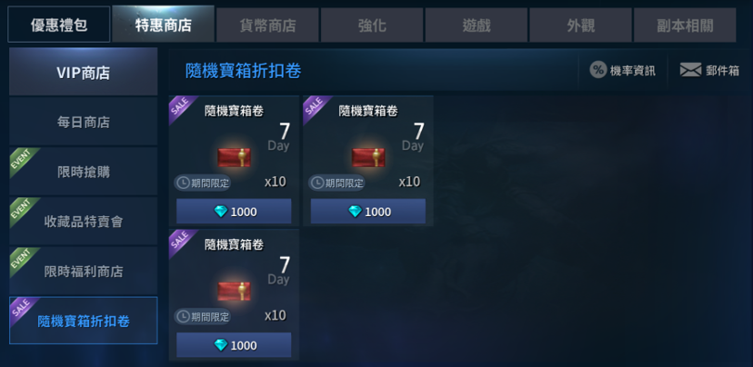 販賣位置:由遊戲中進入契約小舖,並於特惠商店中的【隨機寶箱折扣卷】分頁購買。