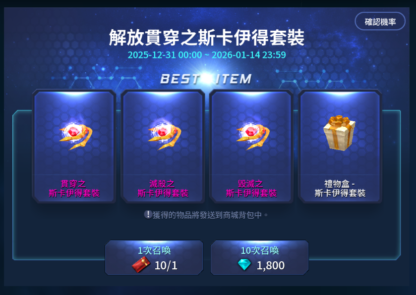 例:下圖中的隨機寶箱卷,為"解放貫穿之斯卡伊得套裝"專用的隨機寶箱卷,僅能抽取"解放貫穿之斯卡伊得套裝"隨機寶箱,請各位戰士在購買時多加注意。