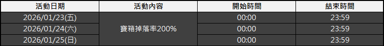 - 活動期間擊殺怪物獲取的寶箱掉落率將提升為200%。