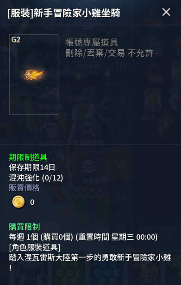 〈[服裝]新手冒險家小雞坐騎(14日)〉