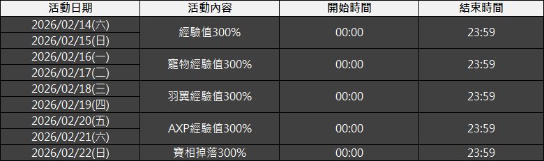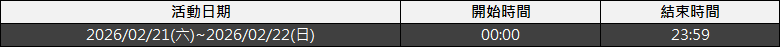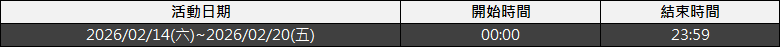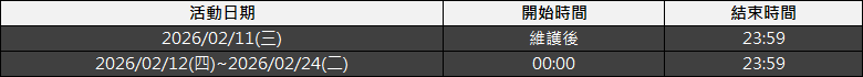 活動時間:2026/02/11 (三) 維護後 ~ 2026/02/24 (二) 23:59