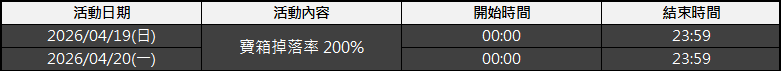 - 活動期間擊殺怪物獲取的寶箱掉落率將提升為200%。