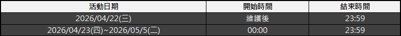 活動時間:2026/04/22(三)維護後~ 2026/04/28(二)23:59